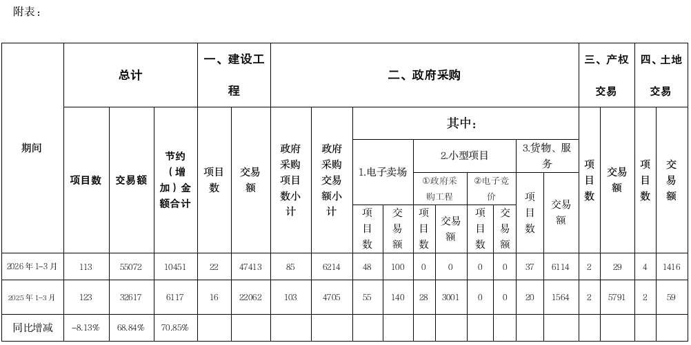 1-3月,累计进入县平台交易项目113个,同比减少8.13%;交易额55072万元,同比增加68.84%;节约(增值)金额10451万元,同比增加70.85%。分项情况:工程建设22个,交易额47413万元,节约资金8815万元;政府采购85个(含电子卖场、小型项目、货物及服务),交易额6214万元,节约资金1636万元;产权交易2个,交易额29万元,增值0万元;土地4个,交易额1416万元,增值0万元。